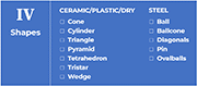 In general, the focus will be on the primary categories of plastic, ceramic/porcelain, and dry polishing media. (Chart IIA) The part material typically dictates the media composition which best suits the grinding or polishing of such. (Chart IIB)