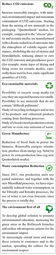 One of the latest developed media is the "Quattrofinish" series (patent pending - I) that offers an innovative, environmentally friendly solution able to reduce finishing costs, and water treatment. The "Quattrofinish" media have a lasting time of approximately 10/20 times higher than ceramic or polyester media, determining a drastic reduction of waste (from 1000% to 2000%). Furthermore, the waste can be recycled.