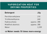 Not to forget that water itself is a finite resource. Water-based cleaning also comes with significant energy demand. There is the need to operate high-pressure pumps, heat the cleaning water, dry the metal parts, as well as treat and purify used water for re-use or disposal. As a relatively slow-drying cleaner, water requires 10 times more latent heat of vaporisation (2259 J/g) than solvents (200-300 J/g).