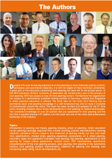 Introduction to peening and theory, peening intensity, effect of peening, Almen saturation curves, peening coverage, exposure time, trouble shooting, process documentation, masking solutions, workpiece fixtures, shape & size inspection of peening media, cut wire, cast steel shot, specifications, shaded strips, peening equipment components, air & wheel peening, machinery types and application examples, hole peening, flap peening, optimization of shot peening for fatigue critical applications, residual stress, XRD measurement, quantitative characterization of the shot peening process, laser peening, shot peening in the automotive industry, shot peening process improvements, additives for peening and blasting; also introducing deep rolling, future developments, etc.